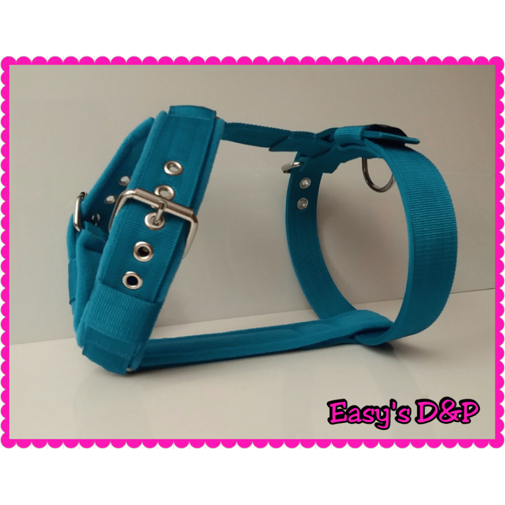 Het turquoise tuig is zoals een tuig met verstelbare gespen op de borst eruit ziet.