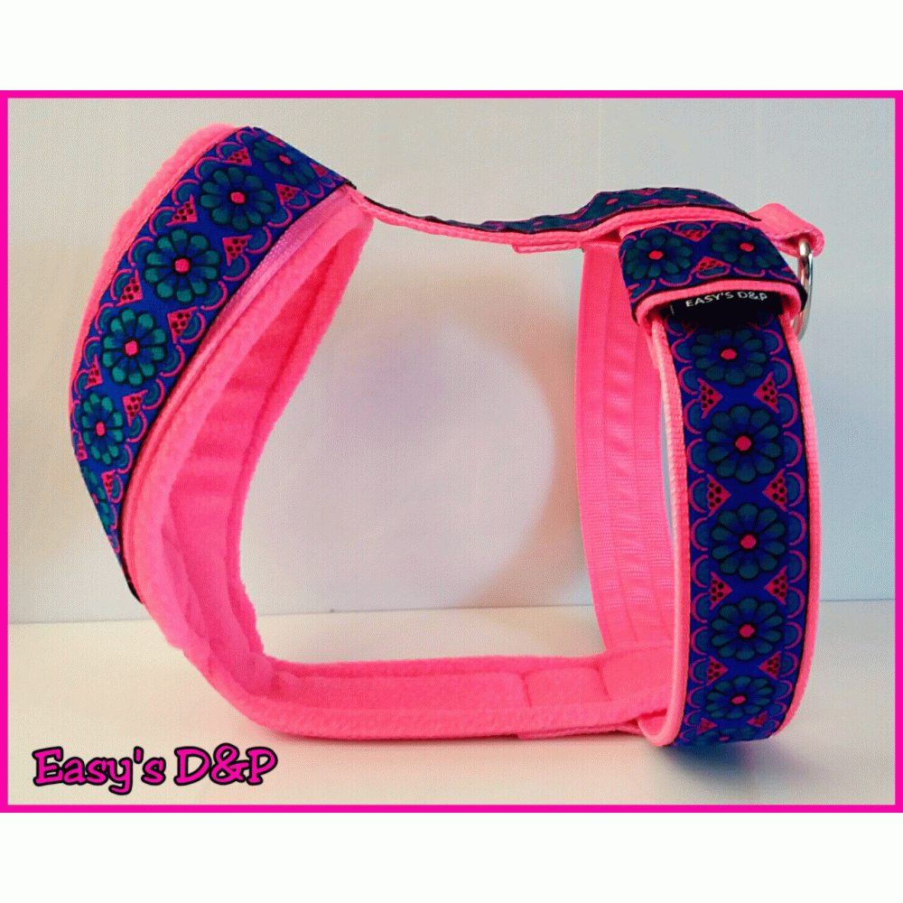 Het turquoise tuig is zoals een tuig met verstelbare gespen op de borst eruit ziet.