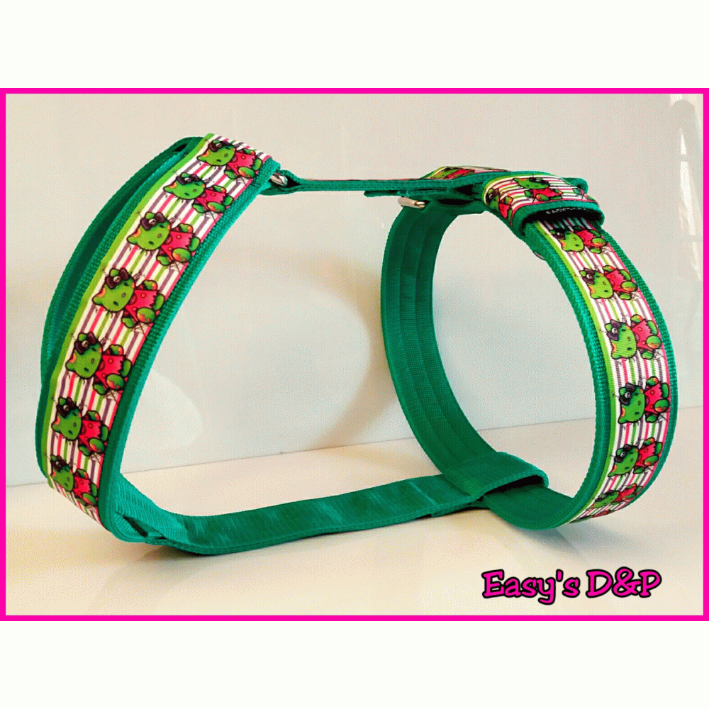 Het turquoise tuig is zoals een tuig met verstelbare gespen op de borst eruit ziet.
