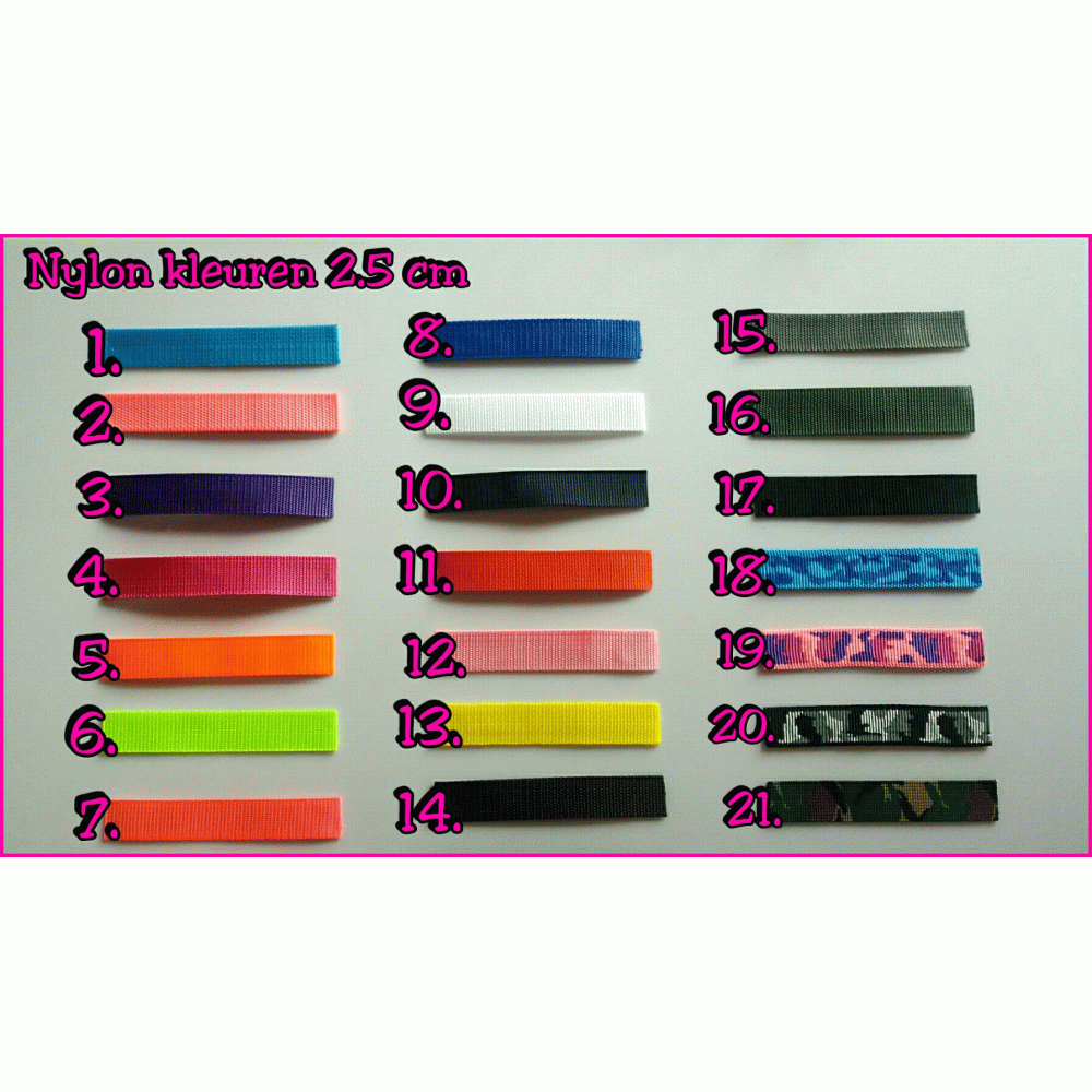 Nylon is 2,5 cm breed, bestaat uit 2 lagen nylon, mogelijk met of zonder voering op de snuit om schuren tegen te gaan.