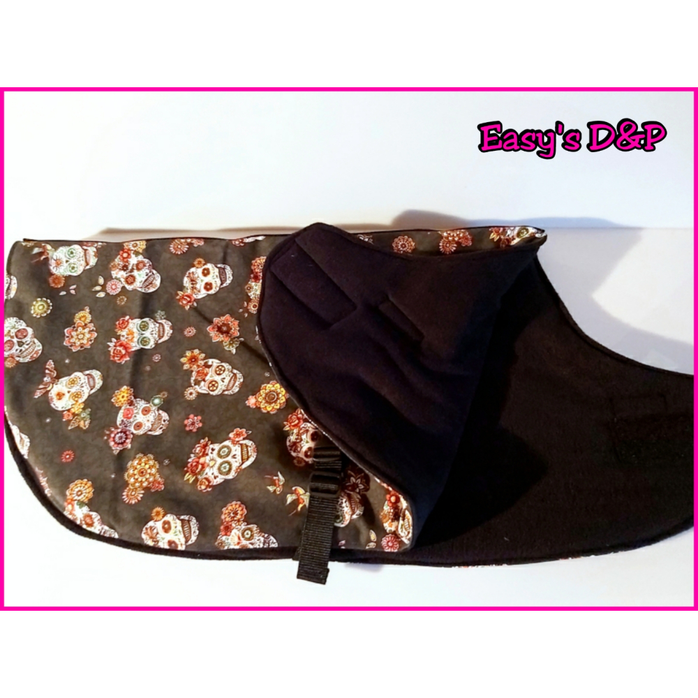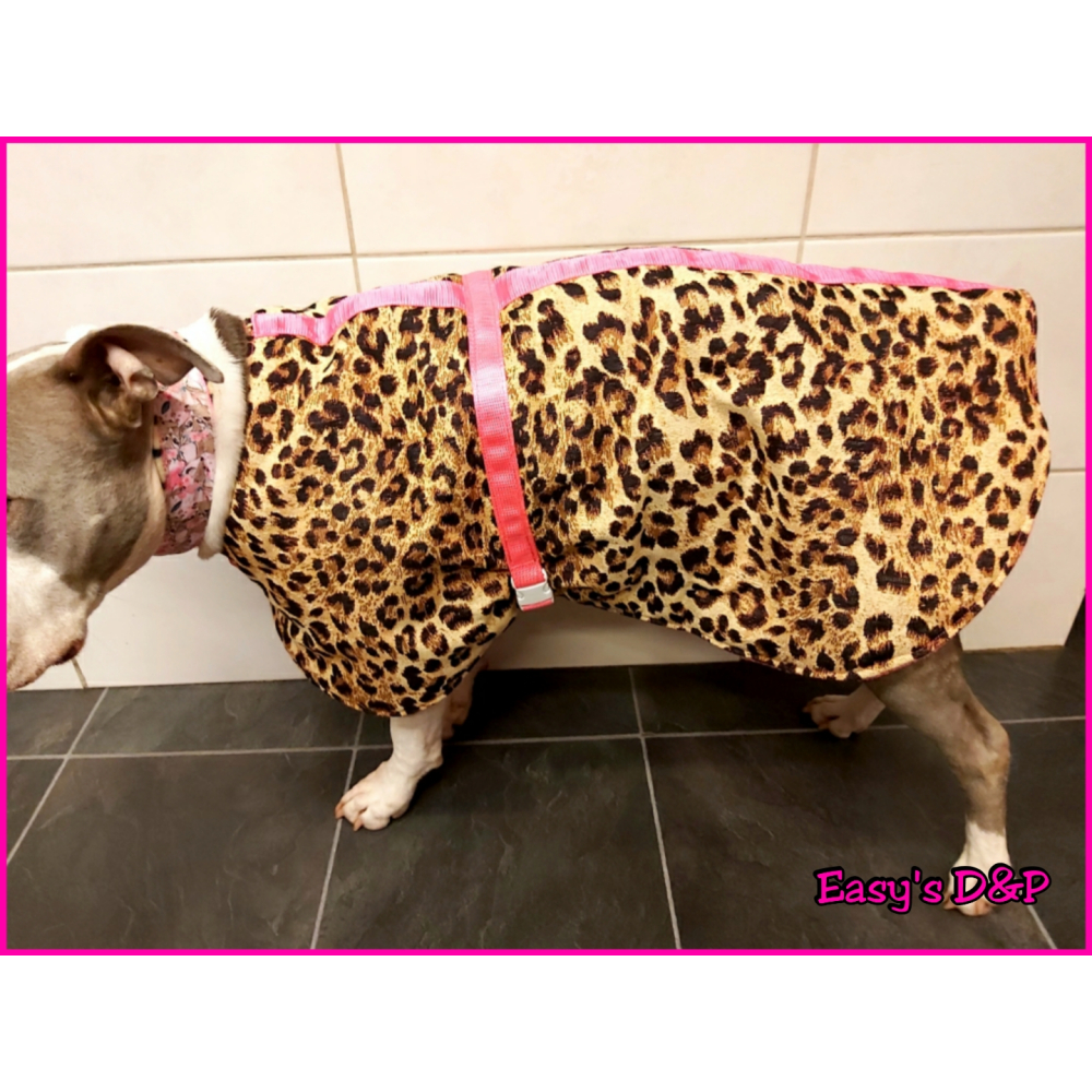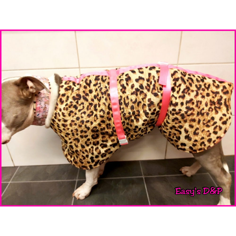 De tweede buikband is een los bandje dat te verstellen is, deze word vast gemaakt bij de buik voor de achtepoten zodat de buik ook bedekt is. Eventueel kan een jasje ook langer worden gemaakt, dit graag bespreken via prive bericht.